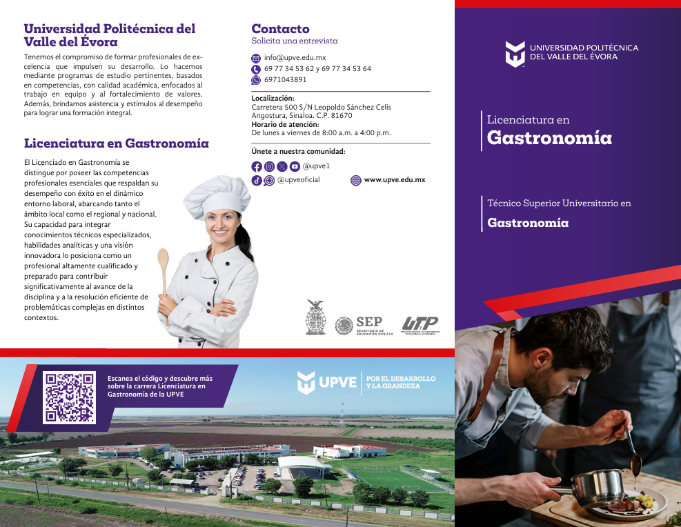 Al estudiar tu Carrera Profesional en la UPVE, tienes la oportunidad de obtener dos Títulos Profesionales. Al finalizar el 6to cuatrimestre, recibirás el título de Técnico Superior Universitario (TSU) en Gastronomía, y al concluir el 10mo cuatrimestre, obtendrás tu Título de Licenciatura en Gastronomía.