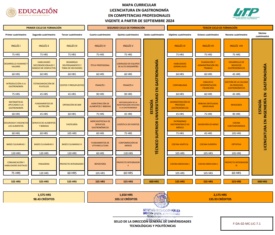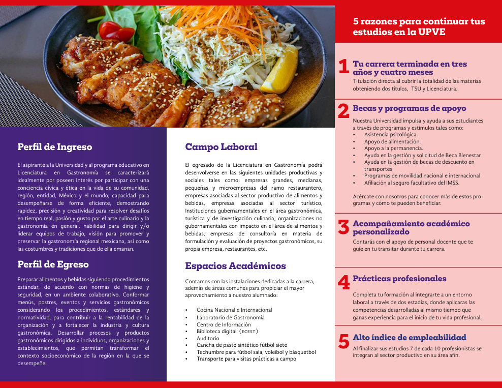 El plan de estudios está diseñado para fomentar la creatividad culinaria, el trabajo colaborativo, el liderazgo, el compromiso ético y el respeto por la cultura gastronómica mexicana y mundial. Asimismo, desarrolla competencias para emprender, gestionar y transformar espacios gastronómicos con enfoque en la innovación, la rentabilidad, la calidad y la sostenibilidad.